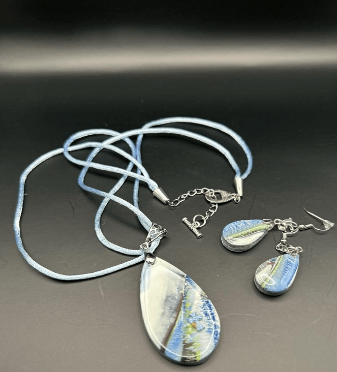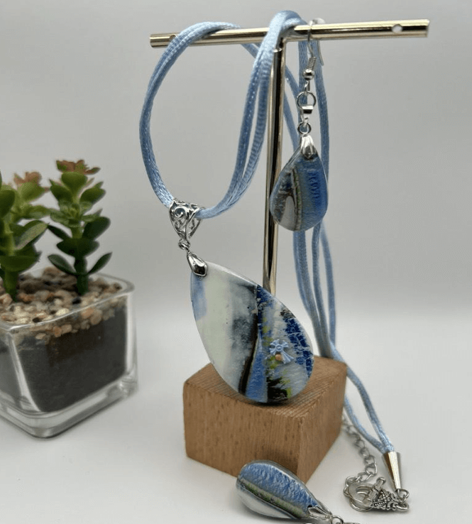 Polymer clay, Resin, Silver colored cross,finding and Silk necklace.
