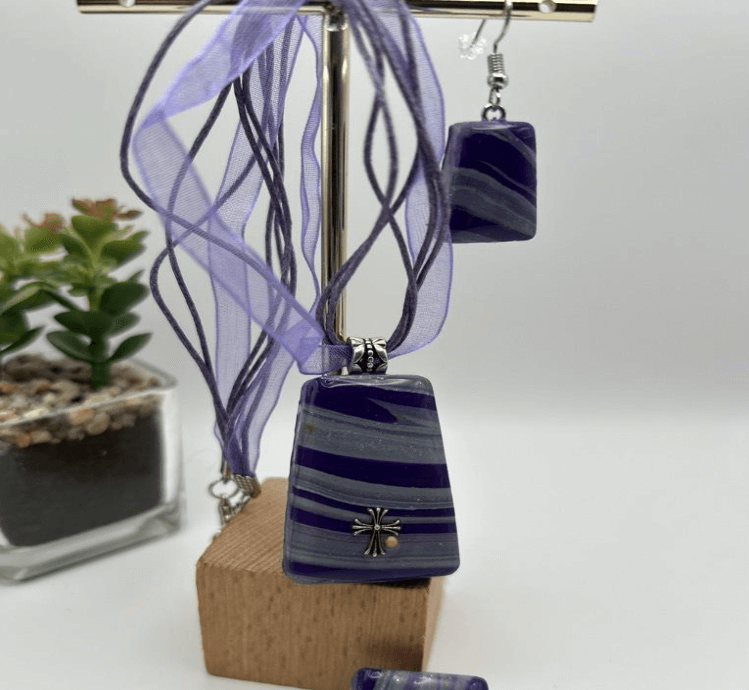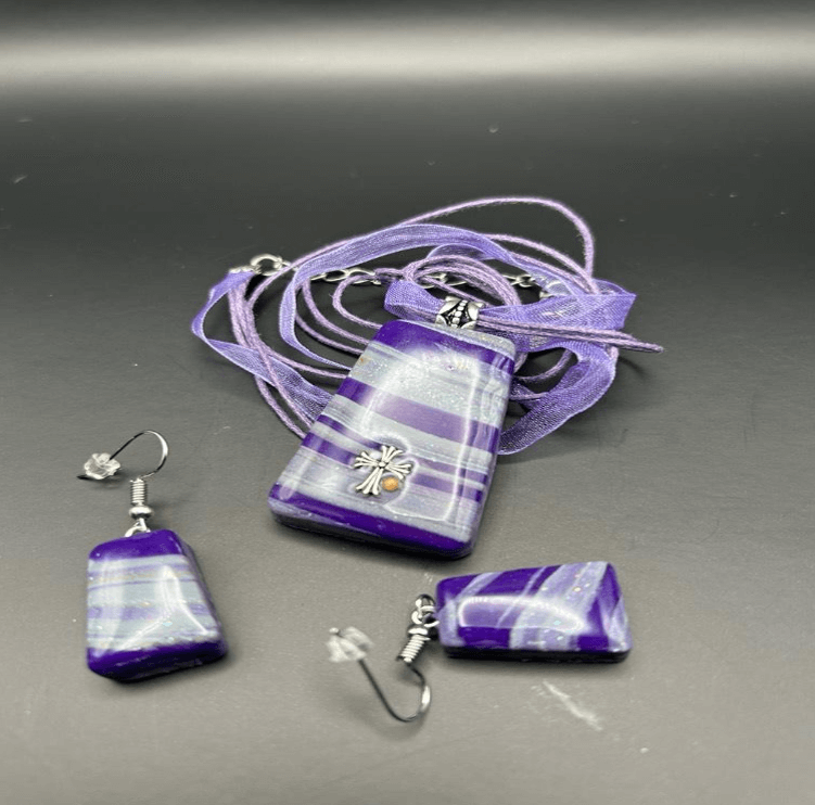 Polymer clay, Resin, Silver colored cross,finding and Silk necklace