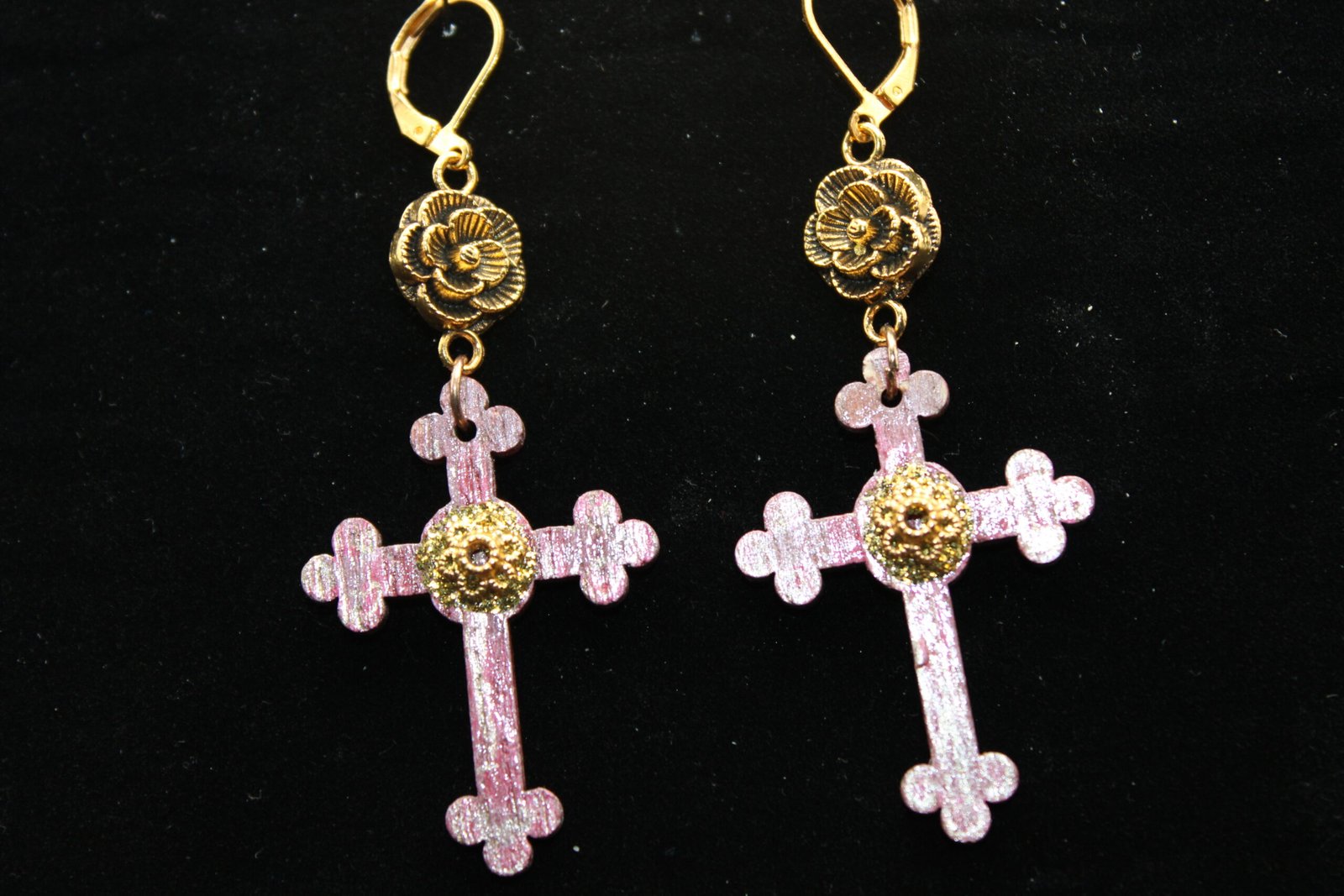 Wood base with gold tone flower embelishments and closed fish hook earrings and findings.