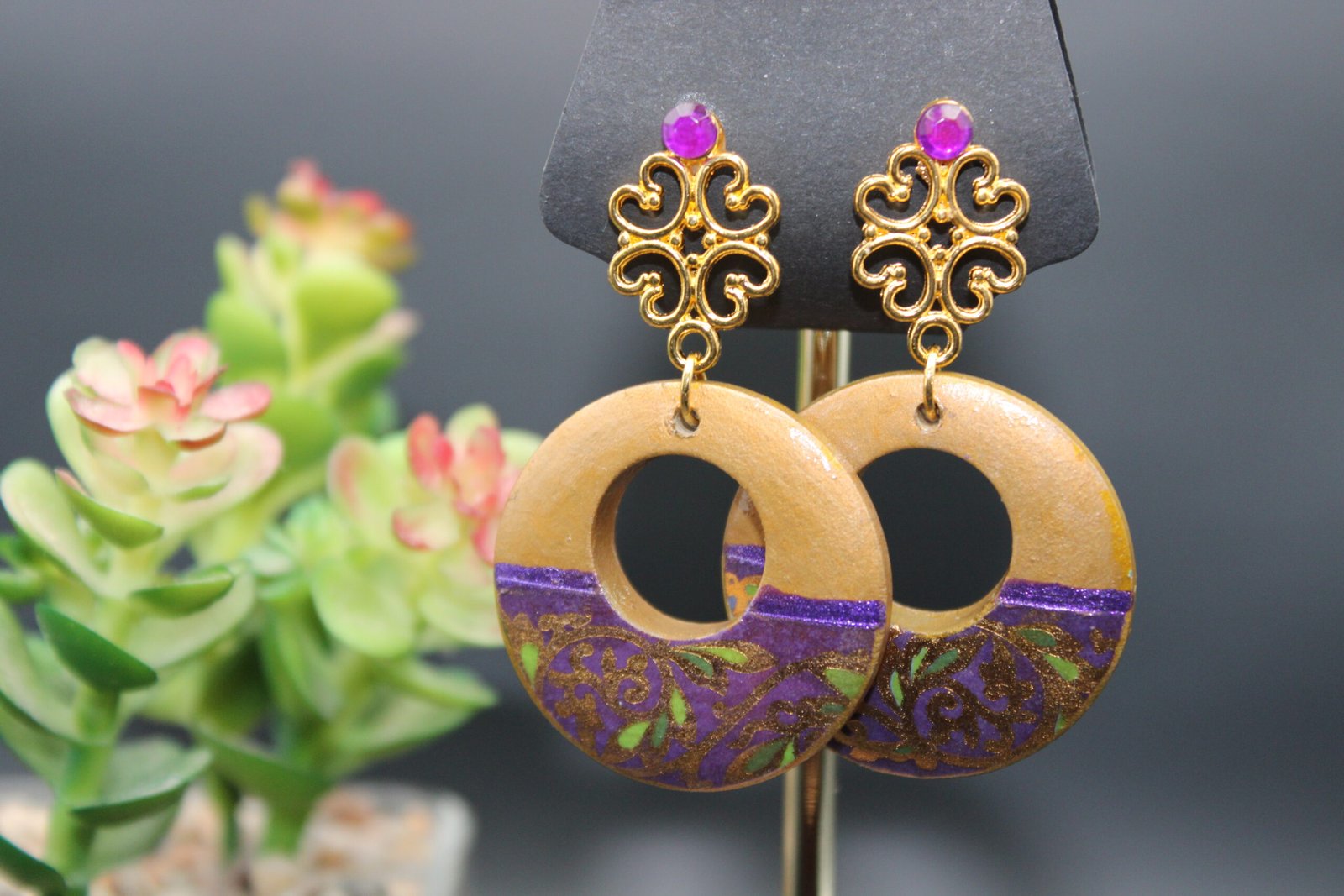 Gold colored wood, washi tape, and metal adornments with stud earrings.