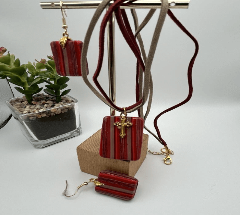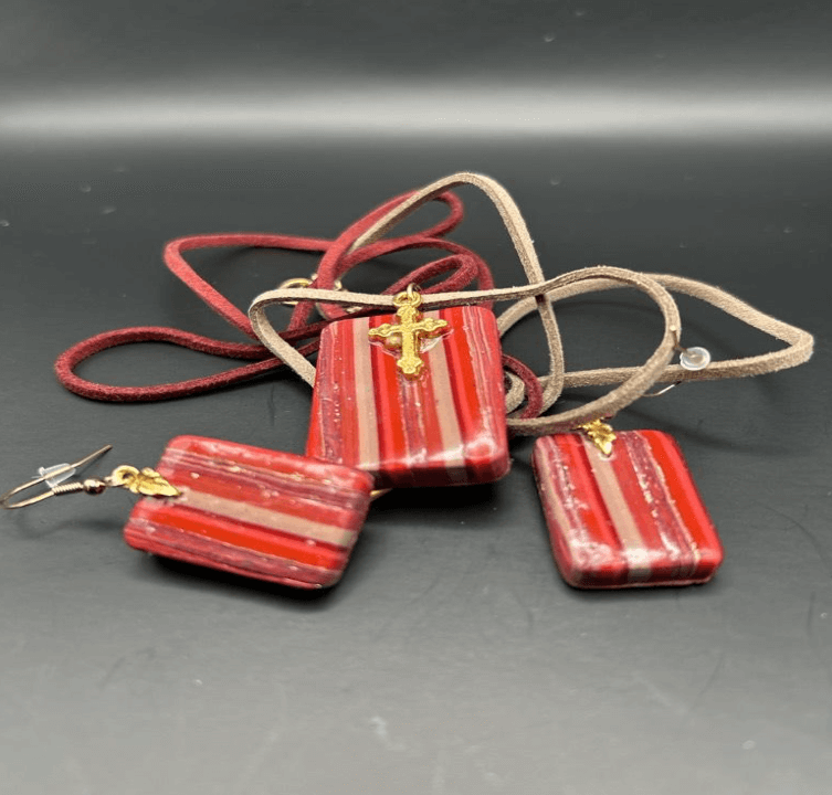 Red and Gold Strip Truquise Pendant and Earrings