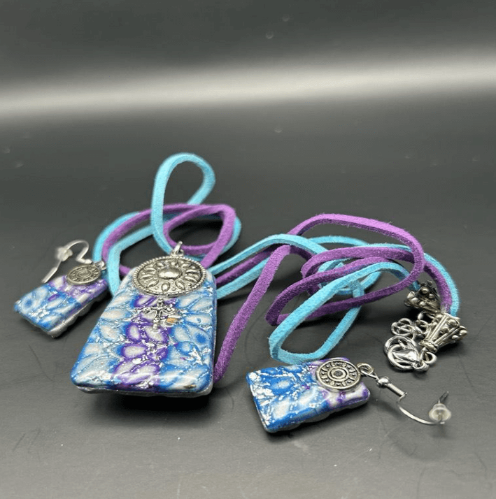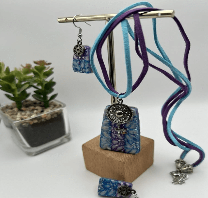 Polymer clay, Resin, Silver colored cross,finding and Silk necklace.